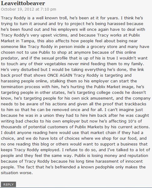 And in closing is this person (Leaveittobeaver) so sure that the individual they are talking about works in a store in Tampa? In fact are they even sure that the person lives anywhere near Tampa (LOL)? If I were you Beav I'd make sure I had my ducks in a row before saying anything else. *QUACK QUACK*
