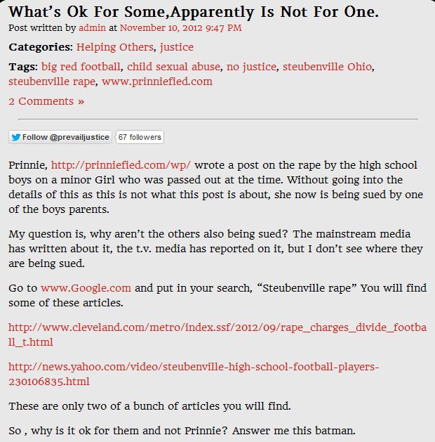 Once again Prinnie is NOT being sued for blogging about the rape case. Prinnie is being sued for blogging about a minor child that she and others have CLAIMED was involved in the rape.